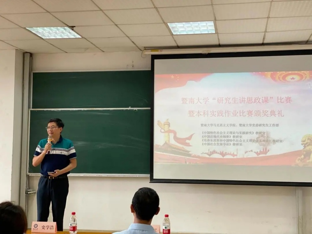 史学浩部长在致辞中强调,思想政治理论课是落实立德树人根本任务的关键课程,我校高度重视思想政治理论课建设,不断推进思政课教学改革创新。此次“研究生讲思政课”比赛,是贯彻落实习近平总书记在十九届中央政治局第三十次集体学习的讲话精神,努力发出中国声音、用心讲好中国故事,以此展示真实、立体、全面的中国。史部长鼓励广大研究生不断提升自身专业能力,把握国内外局势,强化责任担当,讲好暨南故事、广州故事和中国故事。