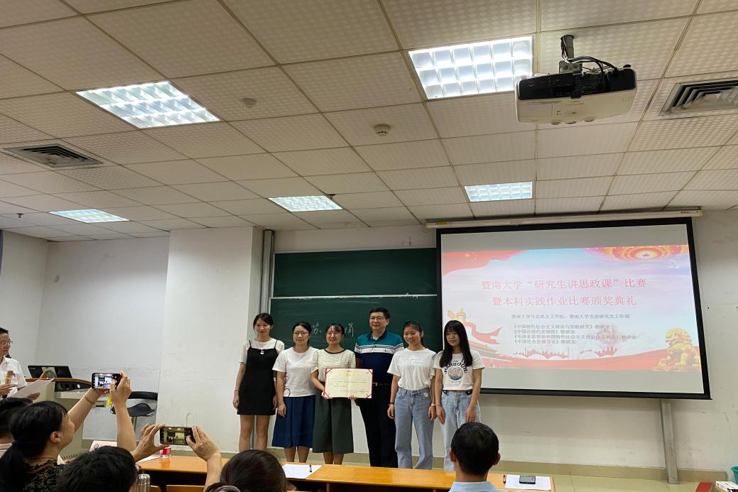 经过评委老师的公正评判,最终来自文学院的方舒雅小组获得一等奖,法学院、知识产权学院的贾晨光小组、新闻传播学院邱淑平小组获得二等奖。由史学浩部长、罗发龙副部长、史军教授分别为获得比赛的一、二、三等奖的小组颁奖并合影留念。本次“研究生讲思政课”比赛决赛暨本科实践作业比赛颁奖典礼圆满落下帷幕。