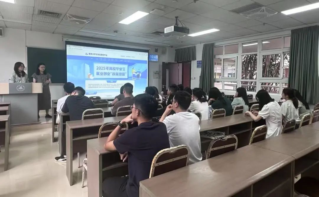 陈濛详细介绍了团组织关系转接、毕业生毕业去向登记、档案转递信息确认、离校手续办理、毕业典礼安排等重要事宜,并基于国家大学生就业服务平台推出的“政策地图”,宣传高校毕业生就业相关政策。陈濛提醒毕业生按时办理各项手续,预祝同学们毕业顺利,期待未来高处相见。